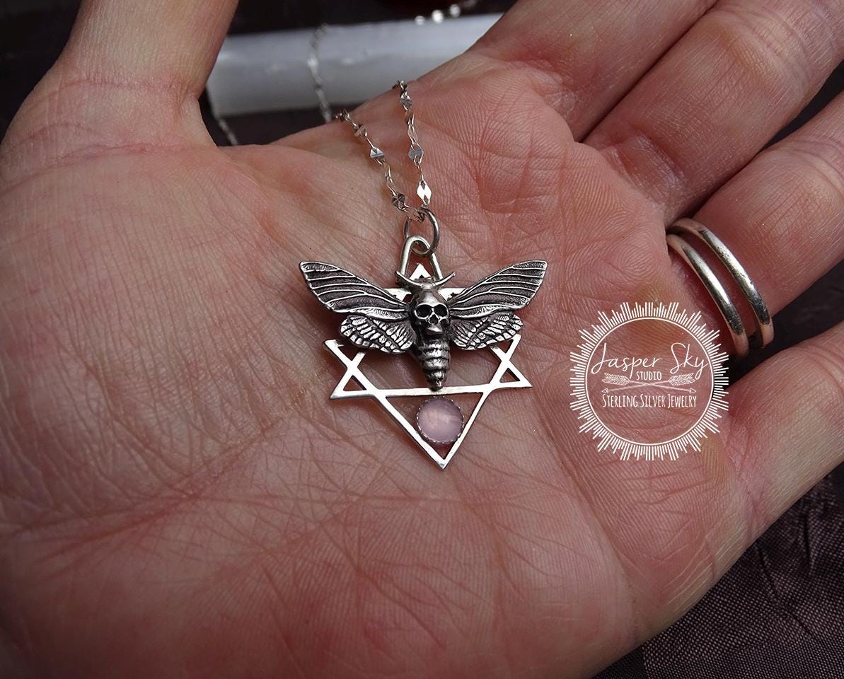 Capture the mystique of nature with this stunning Death Moth Pendant, meticulously handcrafted for those who appreciate unique and bold accessories. Set against a beautifully designed star frame, the centerpiece features a Death's-head hawk moth, renowned for its striking skull-like pattern on the thorax. This eye-catching design is complemented by a bezel-set rose quartz, adding a touch of elegance to the striking sterling silver setting. Whether you’re a nature lover or enjoy statement jewelry, this pendant makes an unforgettable addition to any collection.